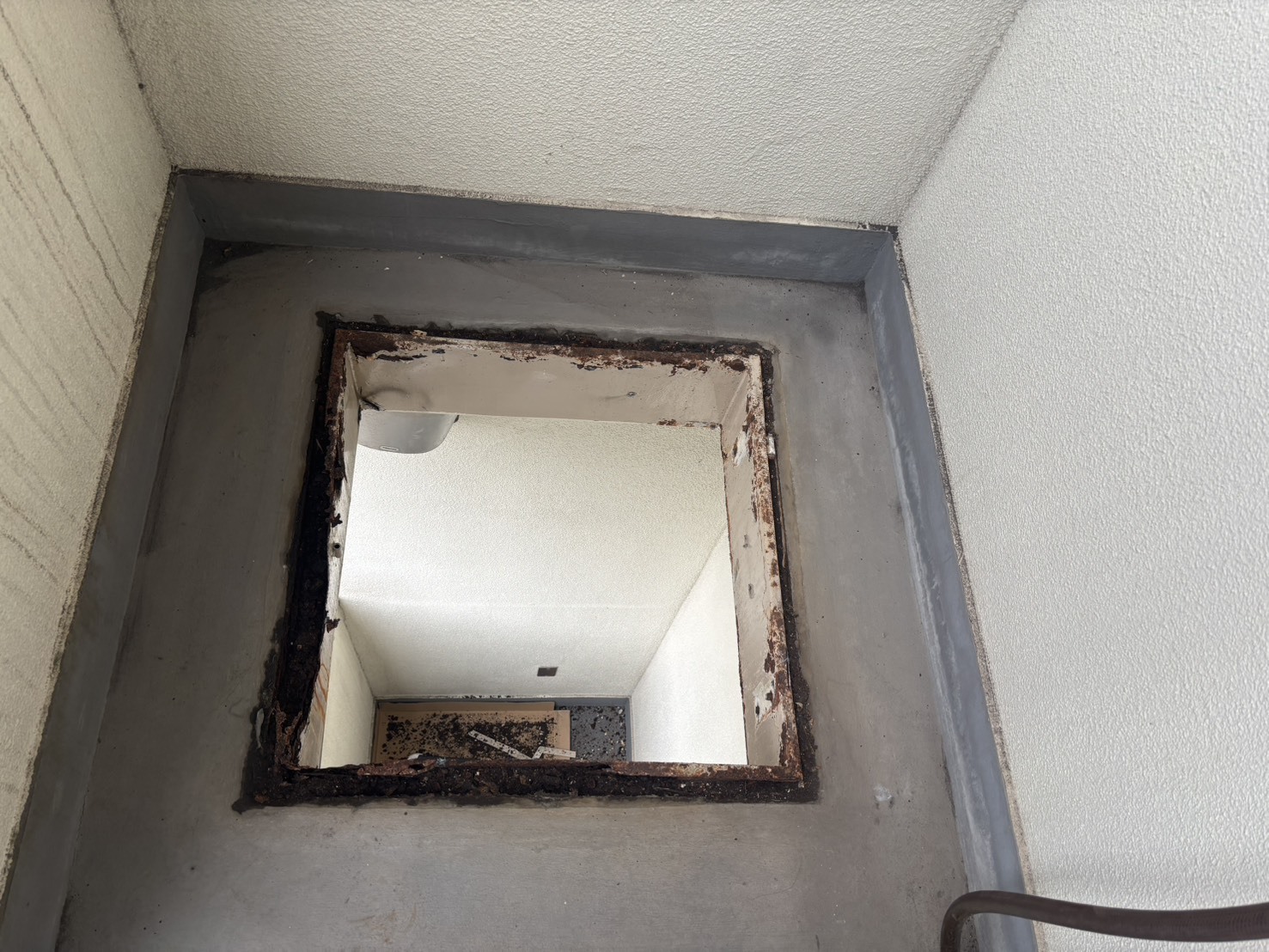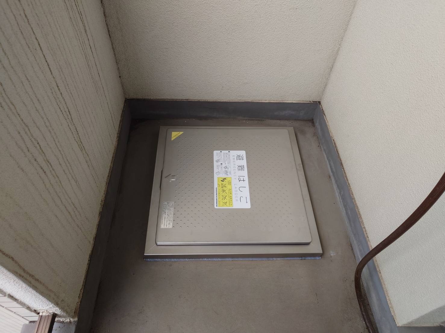 マンションなどのベランダ床に設置します。火災などで通常の避難経路が使えないときに、蓋を開けて梯子を出し下の階へ安全に降りるための緊急避難設備です。